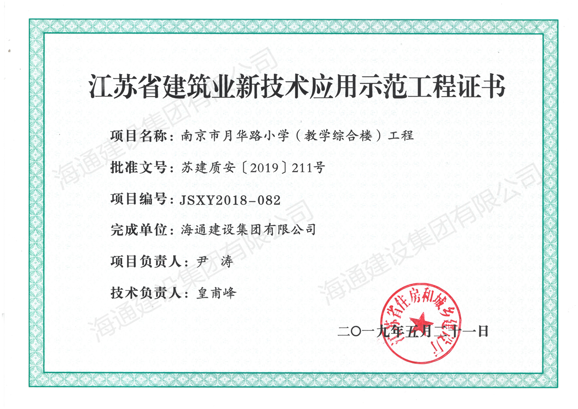 江蘇省建筑業新技術應用示范工程2019南京市月華路小學(教學綜合樓)工程
