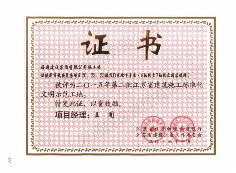江蘇省文明工地2016(秣陵新市鎮(zhèn)安置房項目20.22.23樓及D區(qū)地下車庫)